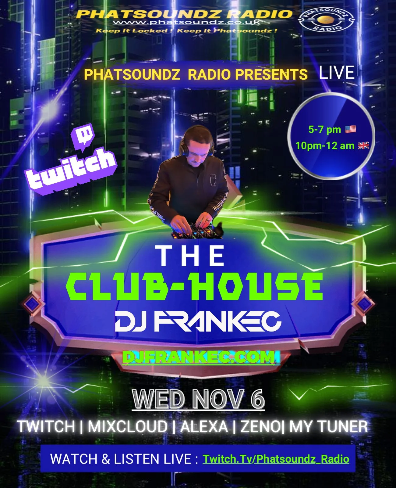 Join DJ FrankEC on Twitch! November 6, 2024 from 5-7pm for a 2 hour Live Stream DJ Set. House, Tech House & Club Remixes! On Phatsoundz Radio!