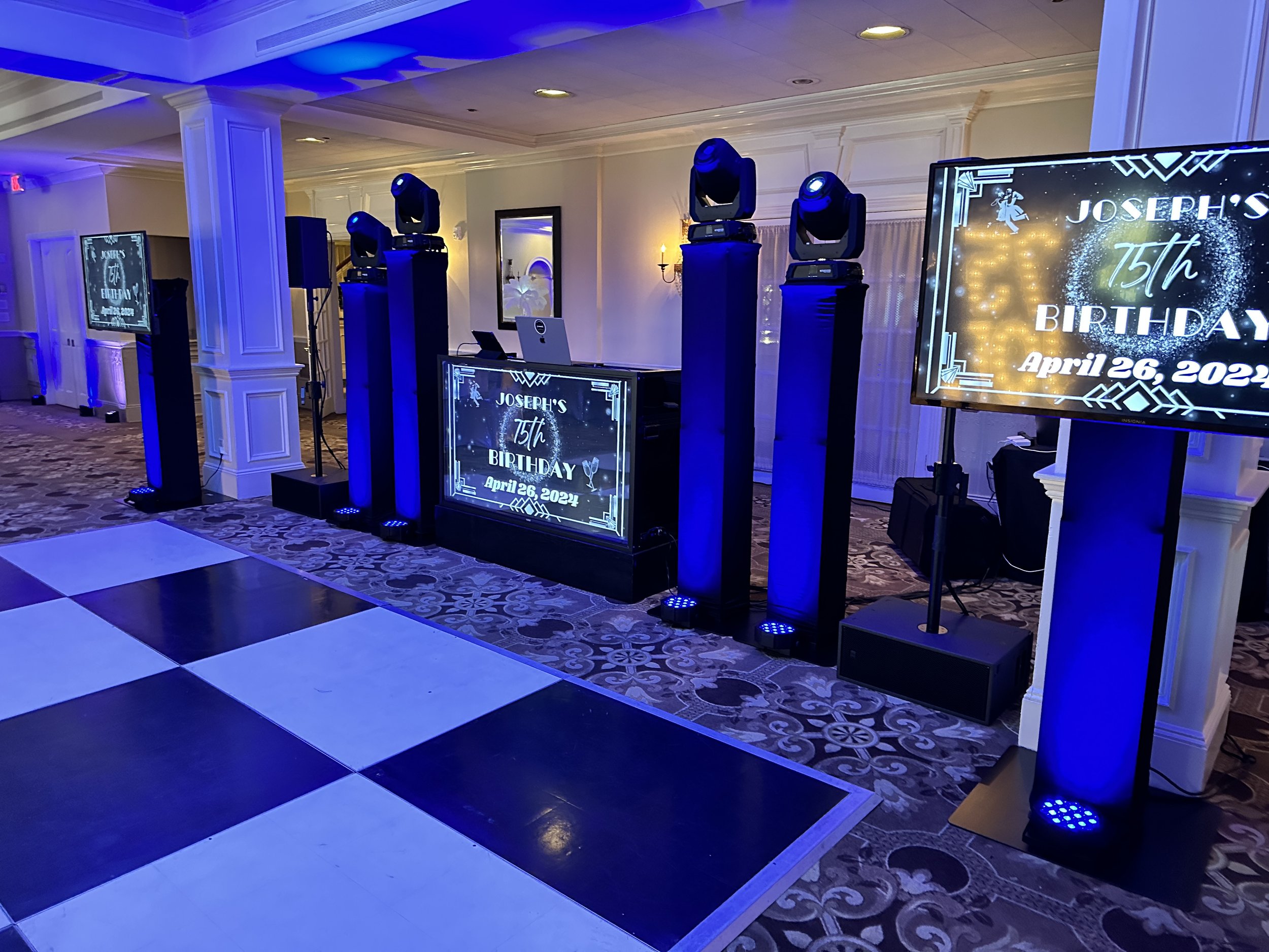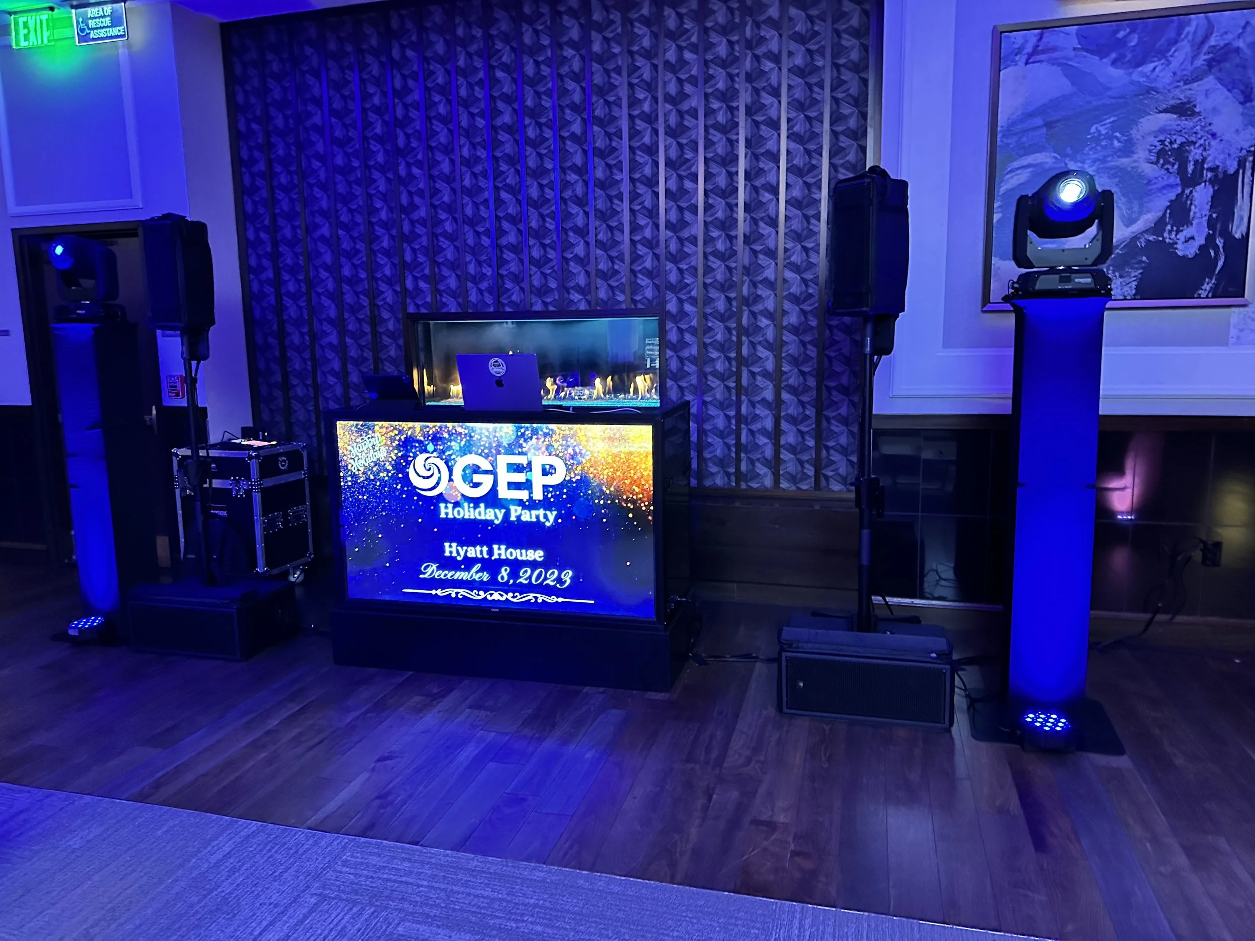 Upgrade your event with a cutting-edge DJ booth featuring an integrated 65” television .